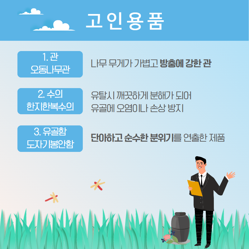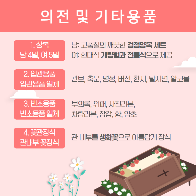 - 꽃관장식: 관 내부를 생화꽃으로 아름답게 장식