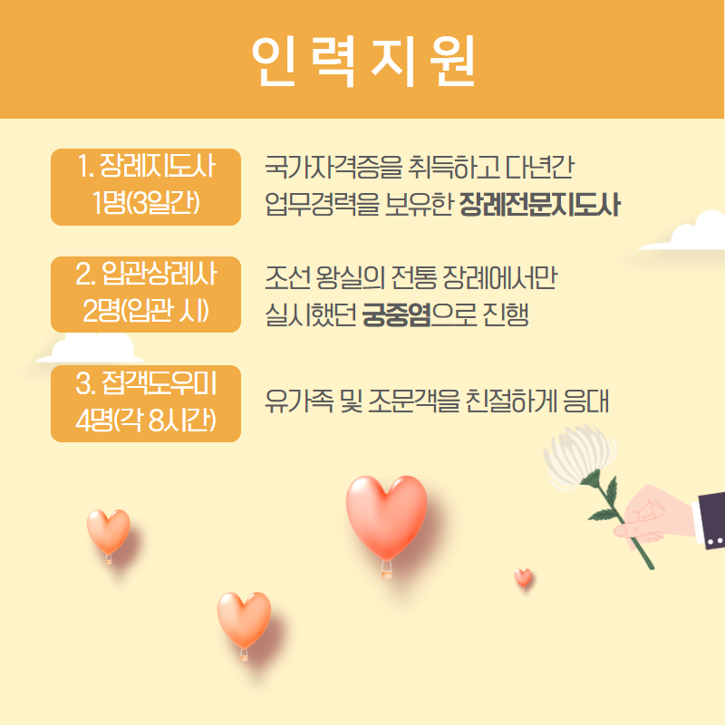 - 접객도우미(6명, 각 8시간): 유가족 및 조문객을 친절하게 응대