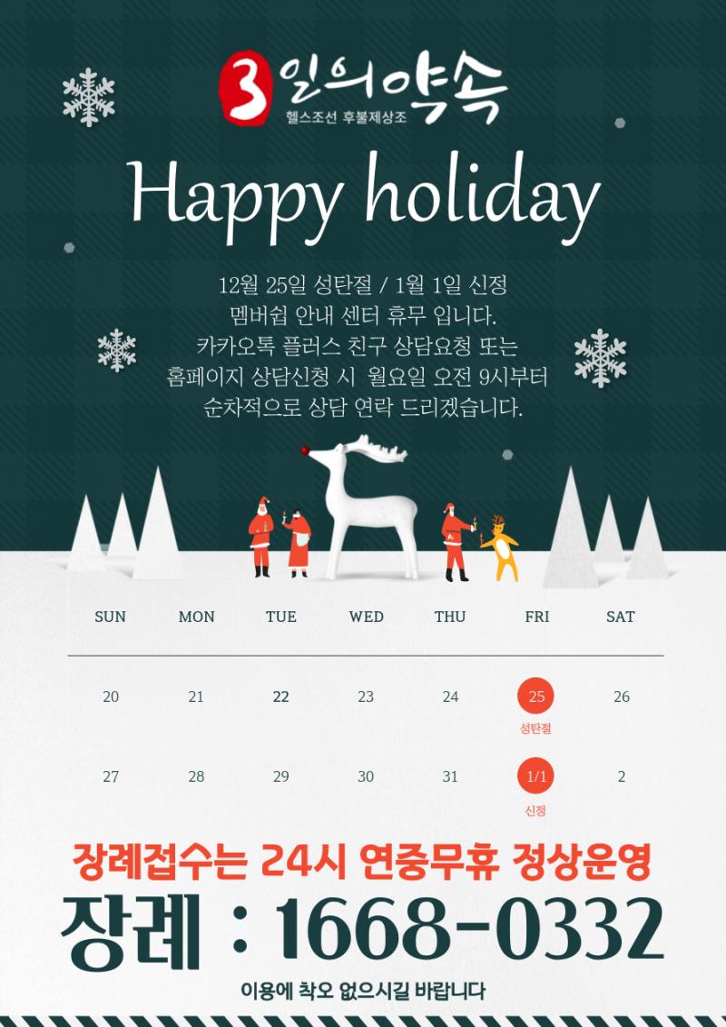 [공지] 고객센터 휴무 안내 페이지 정보 작성자 관리자 작성일20-12-23 10:49 관련링크 이전글 다음글 목록 본문 12월 25일 성탄절 / 1월 1일 신정멤버쉽 안내 센터 휴무 입니다.카카오톡 플러스 친구 상담요청 또는 홈페이지 상담신청 시 월요일 오전 9시부터 순차적으로 상담 연락 드리겠습니다. 장례접수는 24시 연중무휴 정상운영 장례 : 1668-0332 이용에 착오 없으시길 바랍니다 이전글 다음글 목록