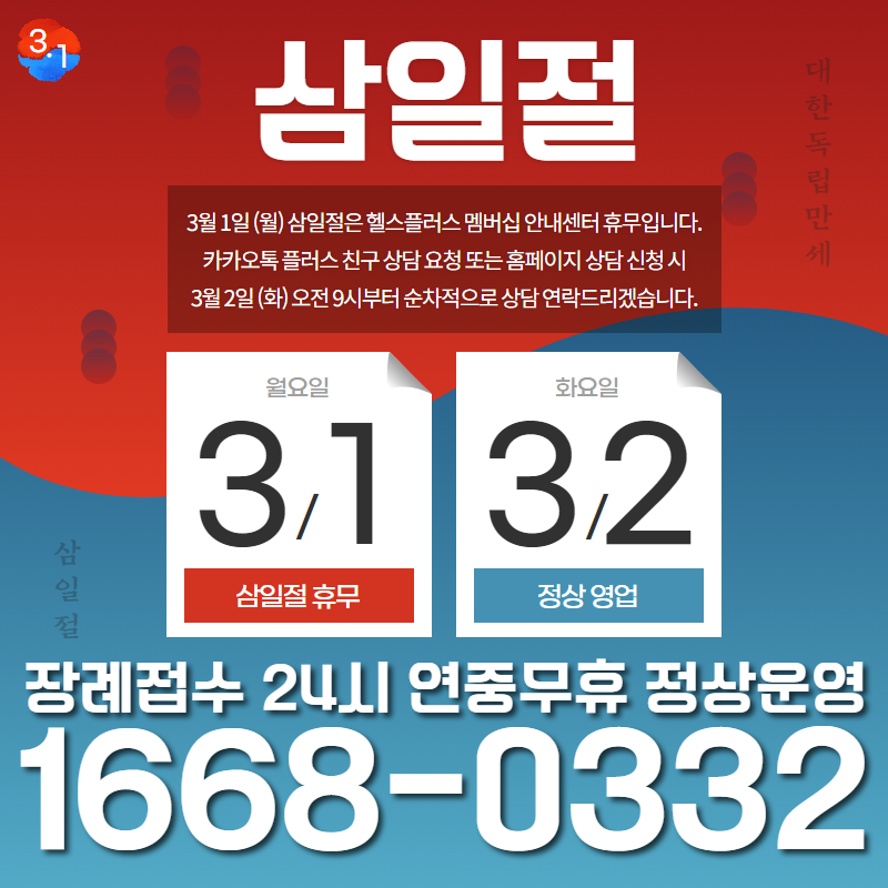 3월 1일 (월) 삼일절은 헬스플러스 멤버십 안내센터 휴무입니다.
