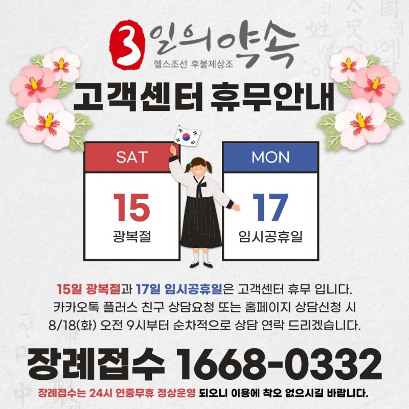 [공지] 고객센터 휴무 안내 페이지 정보 작성자 관리자 작성일20-08-11 10:29 관련링크 이전글 다음글 목록 본문 고객센터 휴무안내15일 광복절과 17일 임시공휴일은 고객센터 휴무 입니다.카카오톡 플러스 친구 상담요청 또는 홈페이지 상담신청 시8/18(화) 오전 9시부터 순차적으로 상담연락 드리겠습니다. 장례접수 1668-0332장례접수는 24시 연중무휴 정상운영 되오니 이용에 착오 없으시길 바랍니다. 이전글 다음글 목록