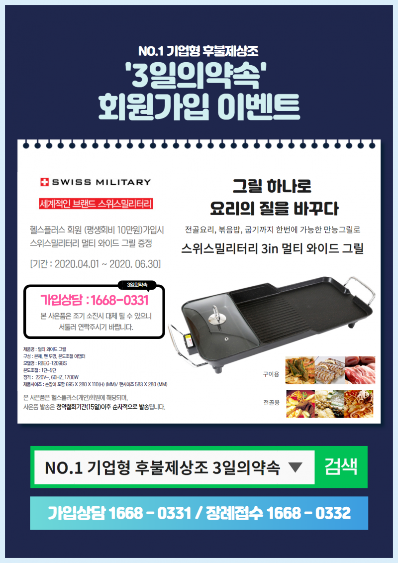 3일의약속 헬스플러스 회원가입 이벤트 - 스위스밀리터리 3in 멀티 와이드 그릴 증정!