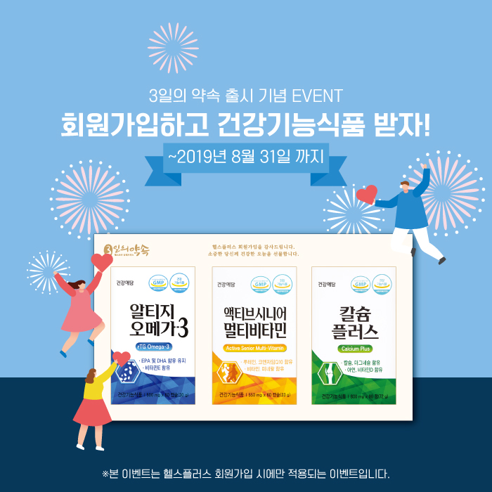 3일의약속 서비스 출시 기념 EVENT! 페이지 정보 작성자 관리자 작성일19-08-08 16:44 관련링크 이전글 다음글 목록 본문 3일의약속 서비스 출시를 기념한 이벤트가 진행중입니다. 헬스플러스 회원 가입을 하시면,헬스조선 B&H에서 공급하는 건강기능식품세트(시중가 65,000원 상당)를 증정합니다. ▶ 이벤트 기간 : ~8월 31일 까지 이전글 다음글 목록