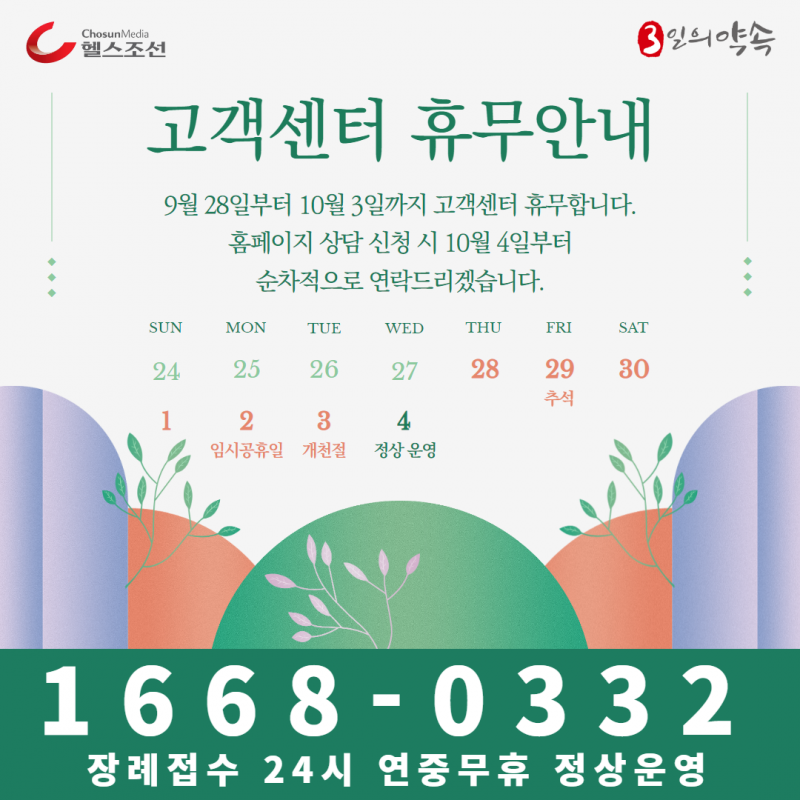 [공지] 고객센터 휴무 안내 페이지 정보 작성자 관리자 작성일23-09-14 10:55 관련링크 이전글 다음글 목록 본문 [고객센터 휴무안내] 9월 28일부터 10월 3일까지 고객센터 휴무입니다.홈페이지 상담 신청시 10월 4일부터순차적으로 연락드리겠습니다. 1668-0332장례접수 24시 연중무휴 정상운영 이전글 다음글 목록