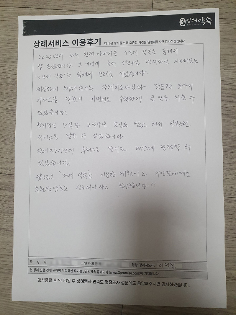 2022년에 저의 친정 아버지를 3일의 약속을 통해서 잘 모셨습니다.