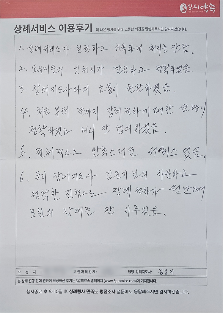 6. 특히 장례지도사 김문기님의 차분하고 정확한 진행으로 장례절차가 원만하여 모친의 장례를 잘 치루었음