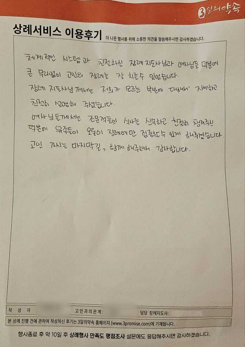 장례 지도사님께서는 저희가 모르는 부분에 대해서 자세하고 친절히 설명해 주셨습니다.