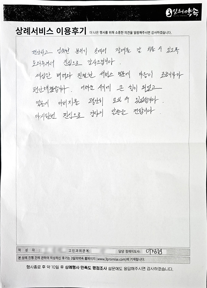 편안하고 엄숙한 분위기 속에서 장례를 잘 치를 수 있도록 도와주셔서 진심으로 감사드립니다.