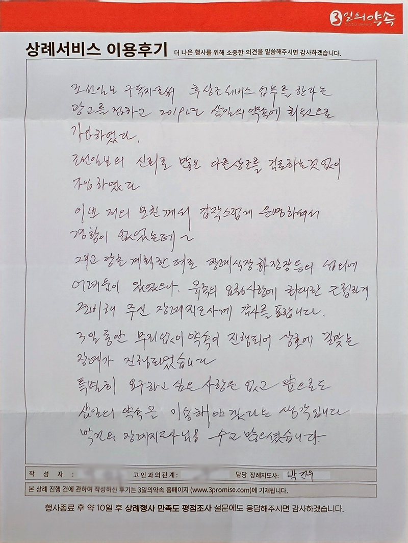 그리고 당초 계획한 대로 장례식장 화장장등의 섭외에 어려움이 있었으나 유족의 요청사항에 최대한 근접하게 준비해 주신 장례지도사께 감사를 표합니다.