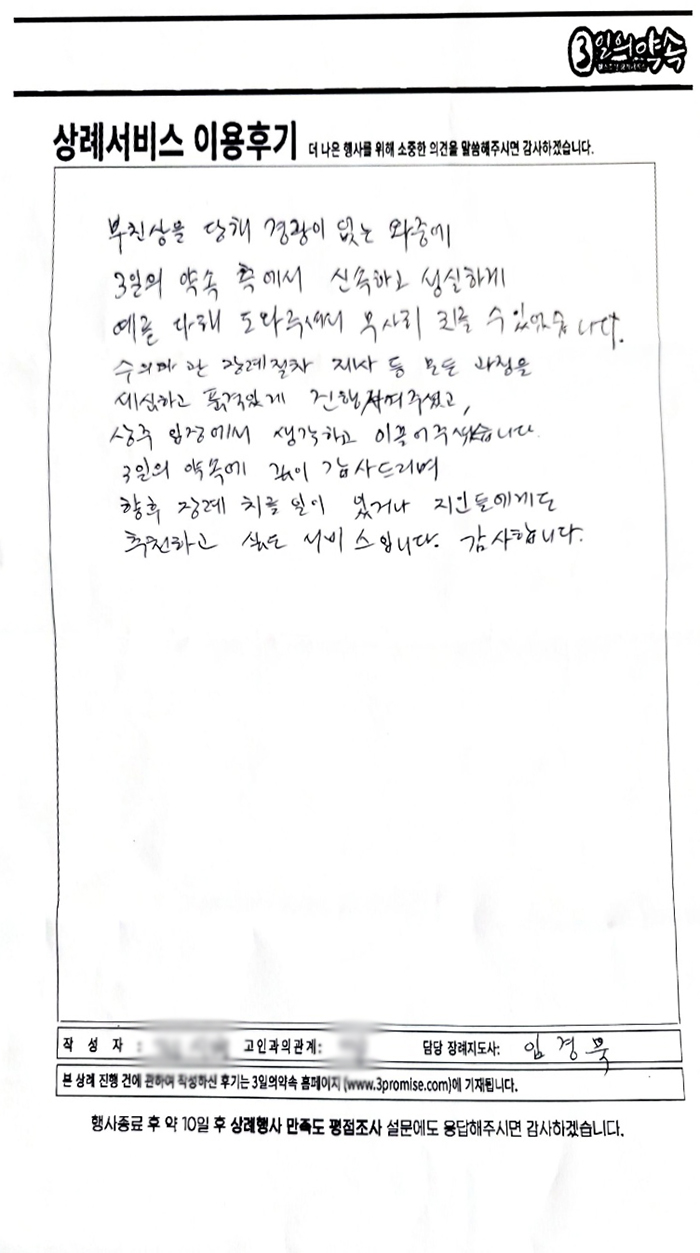 3일의 약속에 깊이 감사드리며 향후 장례 치를 일이 있거나 지인들에게도 추천하고 싶은 서비스입니다.