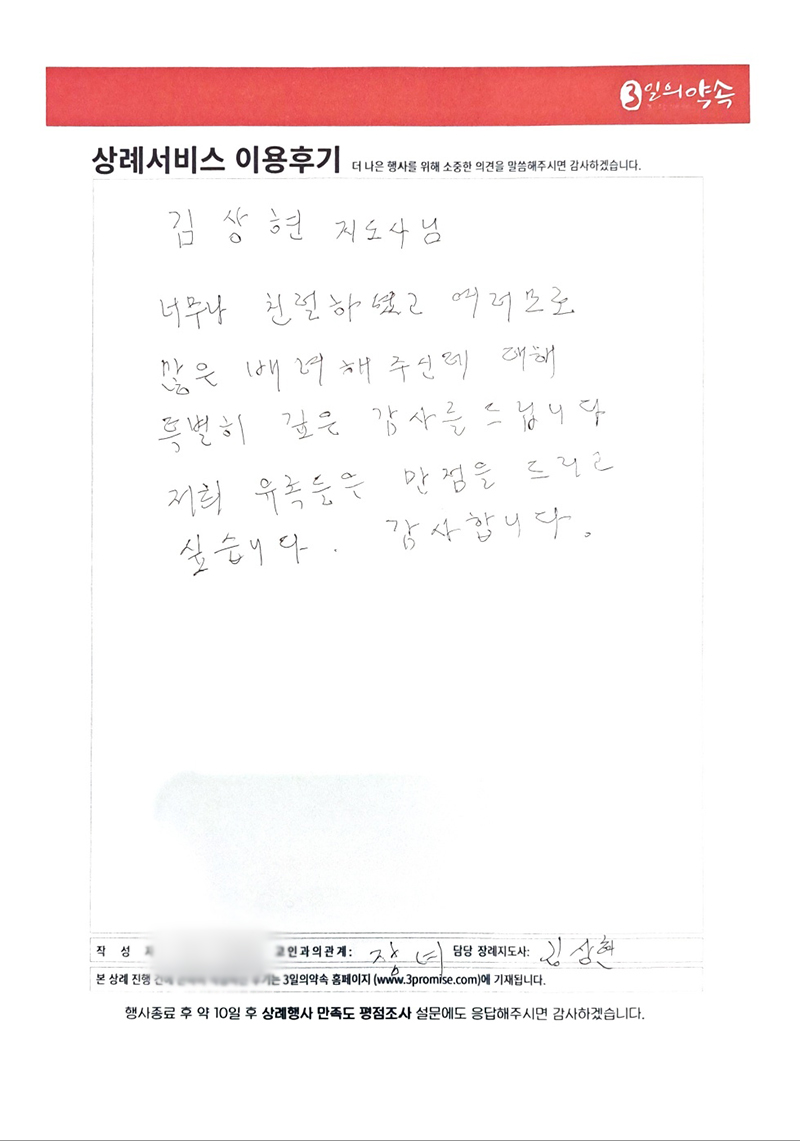 삼성서울병원 장례식장 권○대 회원 장례서비스 이용후기 페이지 정보 작성자 관리자 작성일 목록 본문 김상현 지도사님 너무나 친절하셨고 여러모로 많은 배려해주신데 대해 특별히 깊은 감사를 드립니다. 저희 유족들은 만점을 드리고 싶습니다. 감사합니다. 목록