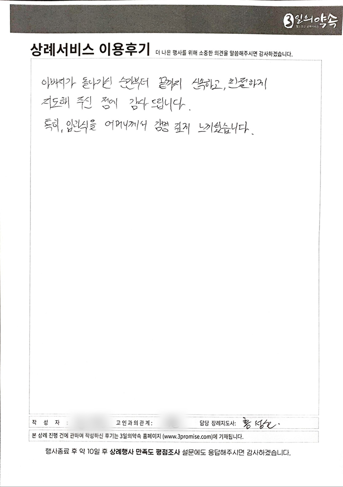 건국대병원 장례식장 강○승 회원 장례서비스 이용후기 페이지 정보 작성자 관리자 작성일 목록 본문 아버지가 돌아가신 순간부터 끝까지 신속하고, 친절하게 지도해 주신 점에 감사드립니다.특히, 입관식을 어머니께서 감명 깊게 느끼셨습니다. 목록