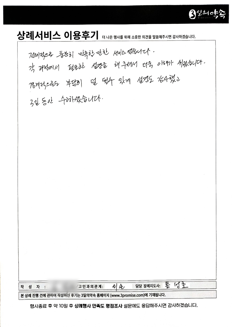 한양대학교병원 장례식장 백○경 회원 장례서비스 이용후기 페이지 정보 작성자 관리자 작성일 목록 본문 전체적으로 충분히 만족할만한 서비스였습니다. 각 과정에서 필요한 설명을 해주셔서 더욱 이해가 쉬웠습니다. 경제적으로도 부담이 덜 될수 있게 설명도 감사했고 3일 동안 수고하셨습니다. 목록