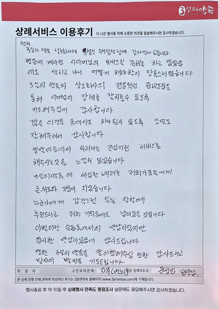 3일의약속의 상조회사의 전문적인 준비도움을 통해 어머님이 장례를 잘치룰수있도록 지도해주심에 감사합니다.