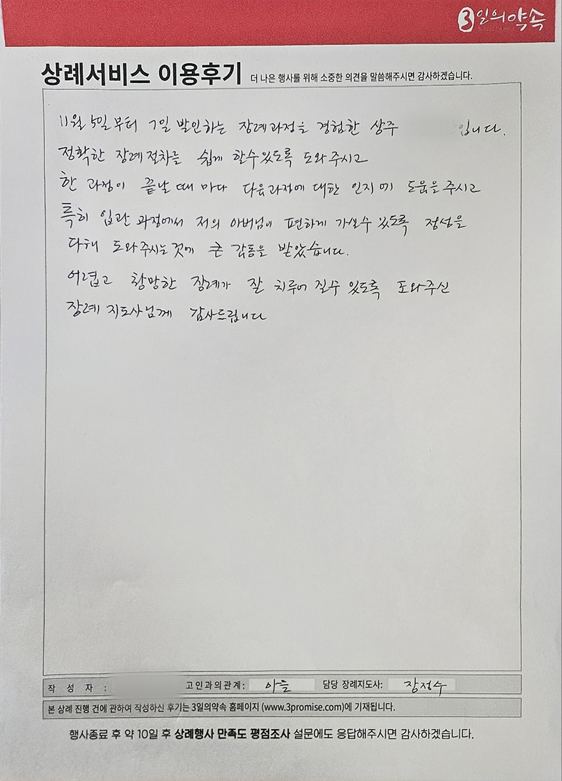대전보훈병원 장례식장 박○병 회원 장례서비스 이용후기