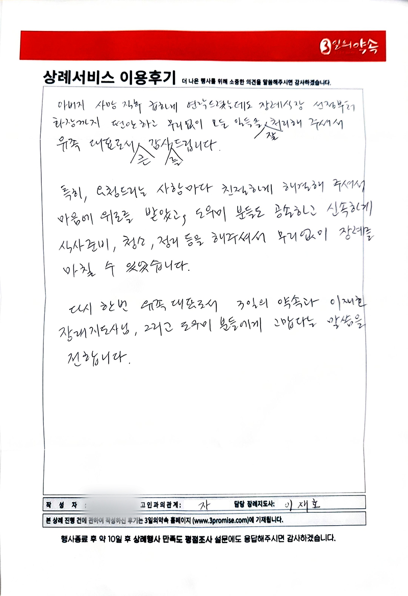 다시 한번 유족 대표로서 3일의약속과 이재호 장례지도사님, 그리고 도우미 분들에게