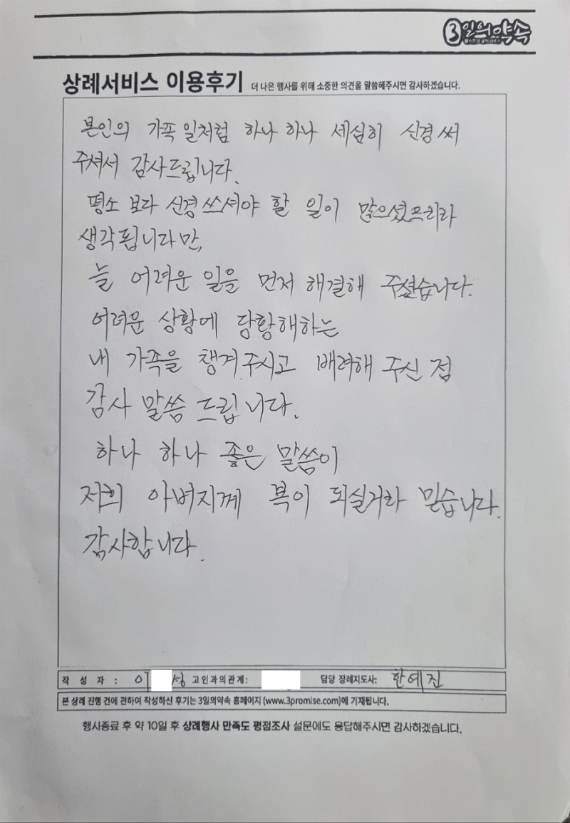 인창병원 장례식장 이○성 회원 장례서비스 이용후기 페이지 정보 작성자 관리자 작성일 목록 본문 본인의 가족일처럼 하나하나 세심히 신경써주셔서 감사드립니다.평소보다 신경 쓰셔야 할 일이 많으셨으리라 생각됩니다만, 늘 어려운 일을 먼저 해결해 주셨습니다.어려운 상황에 당황해하는 내 가족을 챙겨주시고 배려해 주신 점 감사 말씀 드립니다.하나 하나 좋은 말씀이 저희 아버지께 복이 되실꺼라 믿습니다. 감사합니다. 목록