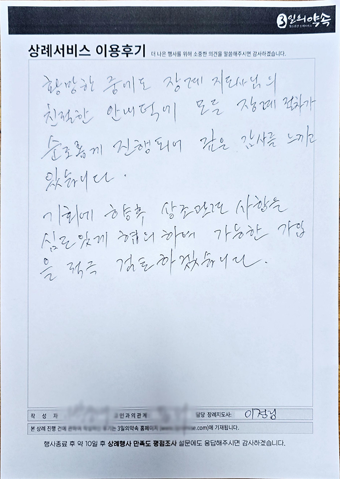 일산복음병원 장례식장 오○자 회원 장례서비스 이용후기 페이지 정보 작성자 관리자 작성일 목록 본문 황망한 중에도 장례 지도사님의 친절한 안내덕에 모든 장례 절차가 순조롭게 진행되어 깊은 감사를 느끼고 있습니다.기회에 향후 상조관련 사항을 심도있게 협의하여 가능한 가입을 적극 검토하겠습니다. 목록