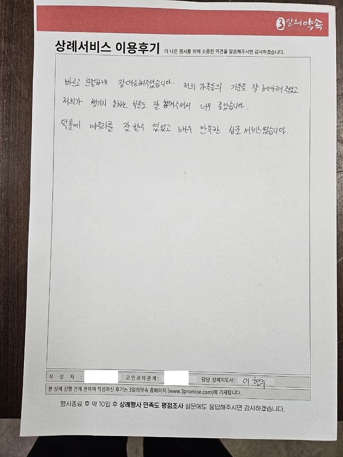 강동성심병원 장례식장 임○경 회원 장례서비스 이용후기 페이지 정보 작성자 관리자 작성일 목록 본문 빠르고 친절하게 잘대응해주셨습니다. 저희 가족들의 기분을 잘 헤아려 주셨고저희가 챙기지 못하는 부분도 잘 챙겨주셔서 너무 좋았습니다. 덕분에 마무리를 잘 할수 있었고 매우 만족한 상조 서비스였습니다. 목록
