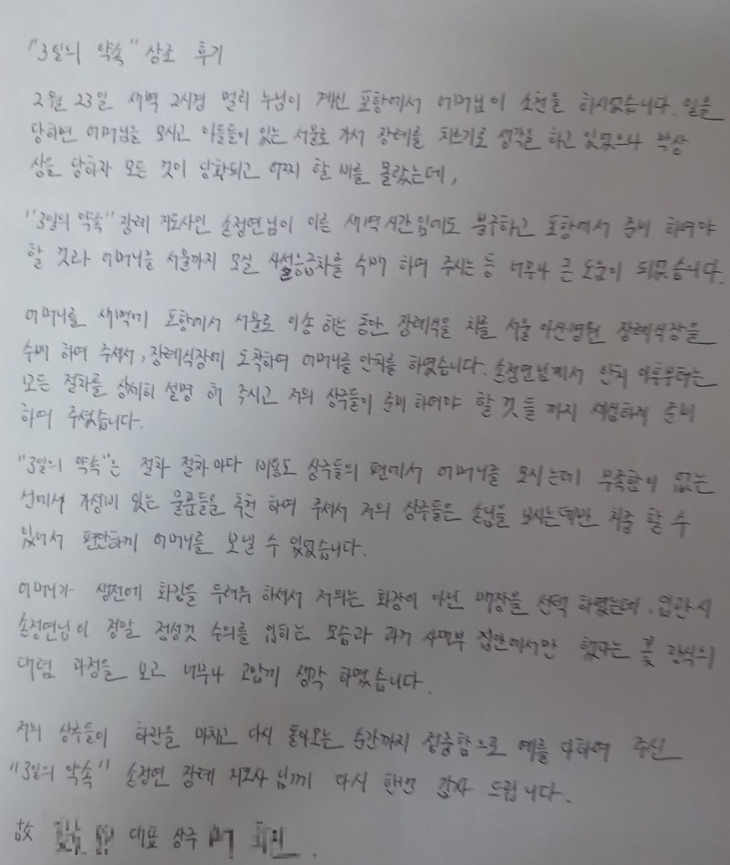 "3일의약속" 장례 지도사인 손정연님이 이른 새벽 시간임에도 불구하고 포항에서 준비하여야할 것과 어머니를 서울까지 모실 사설응급차를 수배하여 주시는 등 너무나 큰 도움이 되었습니다.