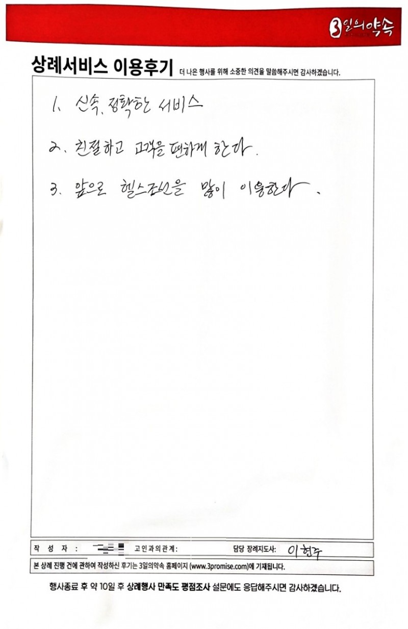 수원요양병원 장례식장 김○륜 회원 장례서비스 이용후기 페이지 정보 작성자 관리자 작성일 목록 본문 1. 신속, 정확한 서비스2. 친절하고 고객을 편하게 한다.3. 앞으로 헬스조선을 많이 이용한다. 목록