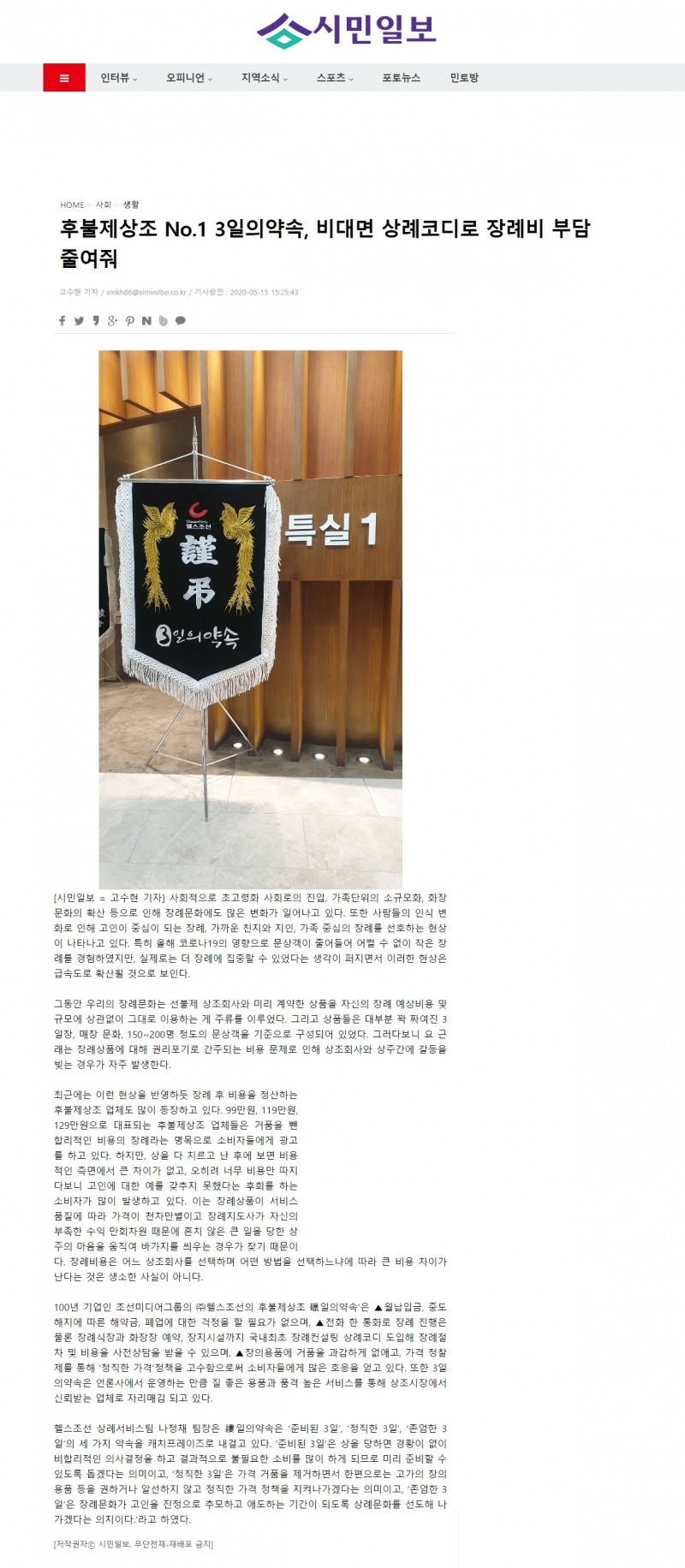 헬스조선 상례서비스팀 나정채 팀장은 䄛일의약속은 ‘준비된 3일’, ‘정직한 3일’, ‘존엄한 3일’의 세 가지 약속을 캐치프레이즈로 내걸고 있다. ‘준비된 3일’은 상을 당하면 경황이 없이 비합리적인 의사결정을 하고 결과적으로 불필요한 소비를 많이 하게 되므로 미리 준비할 수 있도록 돕겠다는 의미이고, ‘정직한 3일’은 가격 거품을 제거하면서 한편으로는 고가의 장의용품 등을 권하거나 알선하지 않고 정직한 가격 정책을 지켜나가겠다는 의미이고, ‘존엄한 3일’은 장례문화가 고인을 진정으로 추모하고 애도하는 기간이 되도록 상례문화를 선도해 나가겠다는 의지이다.‘라고 하였다.