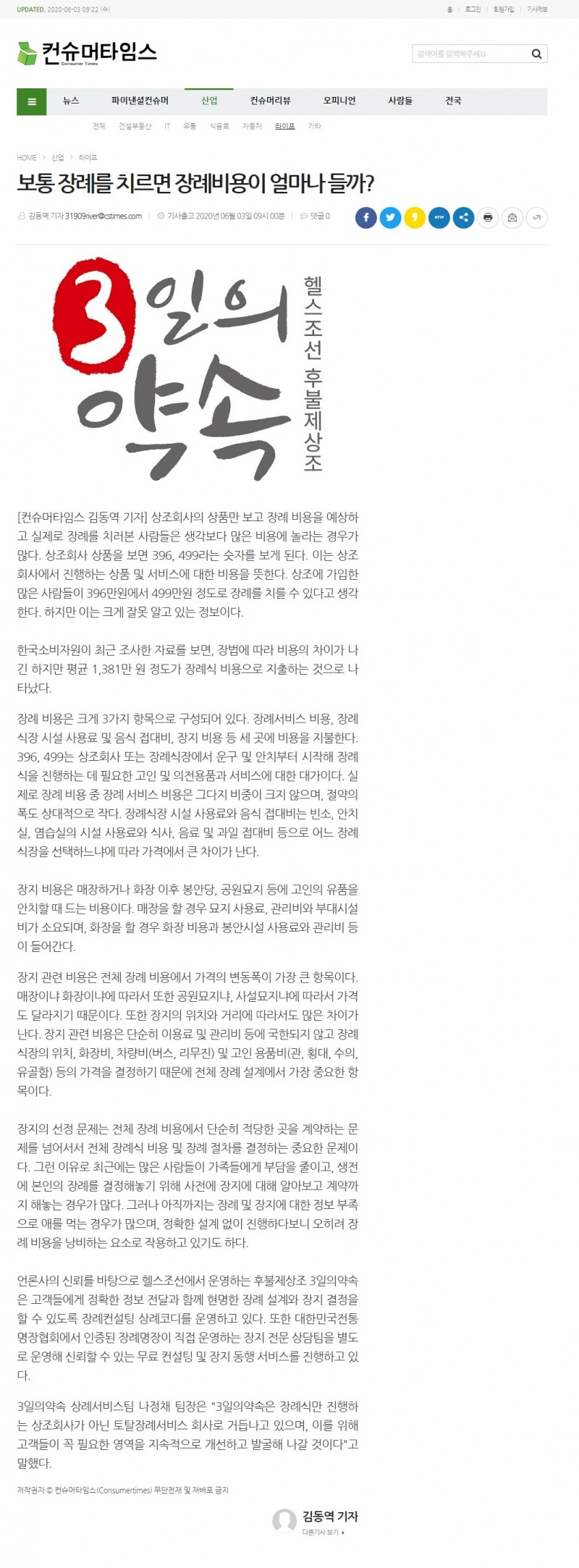 언론사의 신뢰를 바탕으로 헬스조선에서 운영하는 후불제상조 3일의약속은 고객들에게 정확한 정보 전달과 함께 현명한 장례 설계와 장지 결정을 할 수 있도록 장례컨설팅 상례코디를 운영하고 있다. 또한 대한민국전통명장협회에서 인증된 장례명장이 직접 운영하는 장지 전문 상담팀을 별도로 운영해 신뢰할 수 있는 무료 컨설팅 및 장지 동행 서비스를 진행하고 있다.