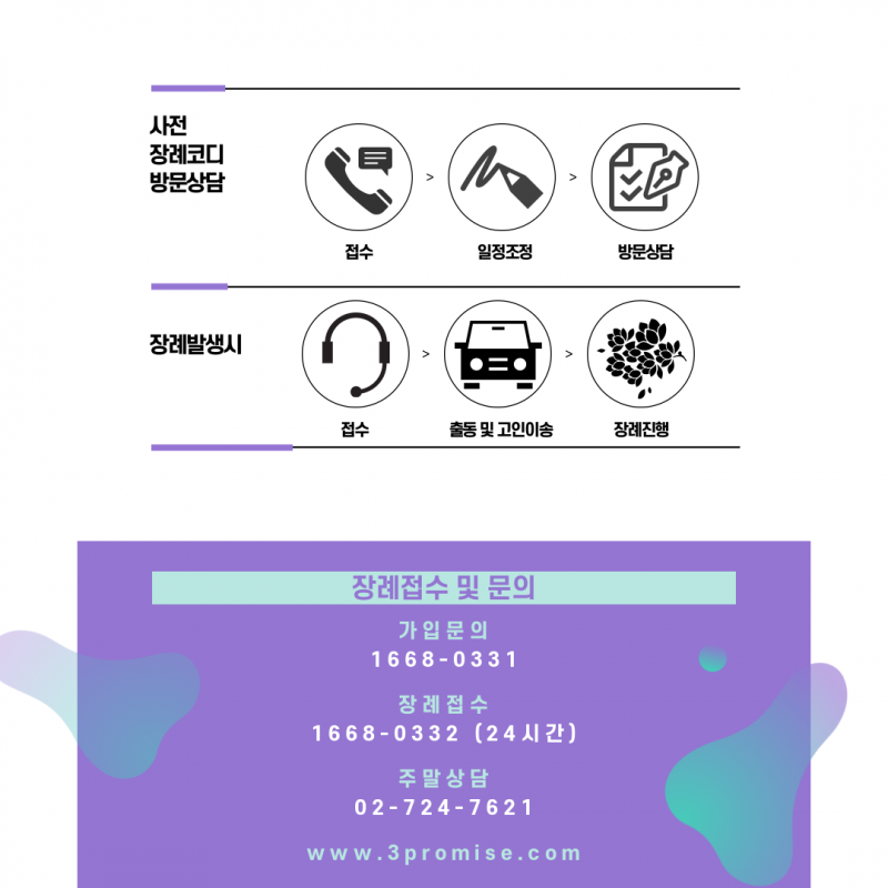 장례발생시 : 접수 > 출동 및 고인이송 > 장례진행