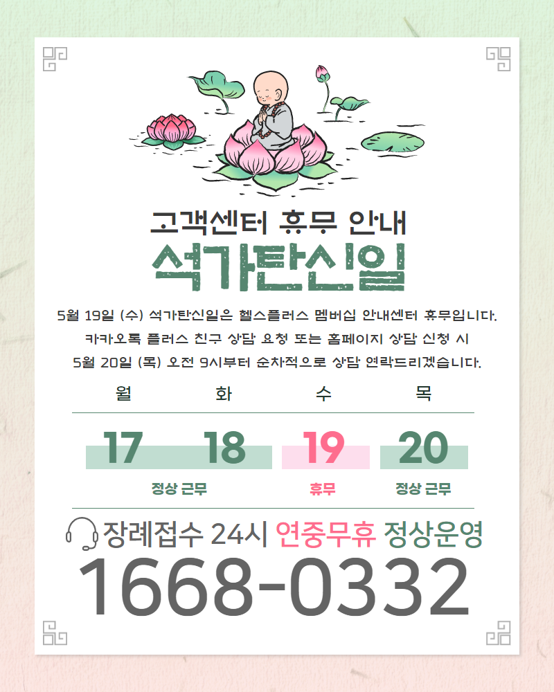 5월 19일 (수) 석가탄신일은 헬스플러스 멤버십 안내센터 휴무입니다.