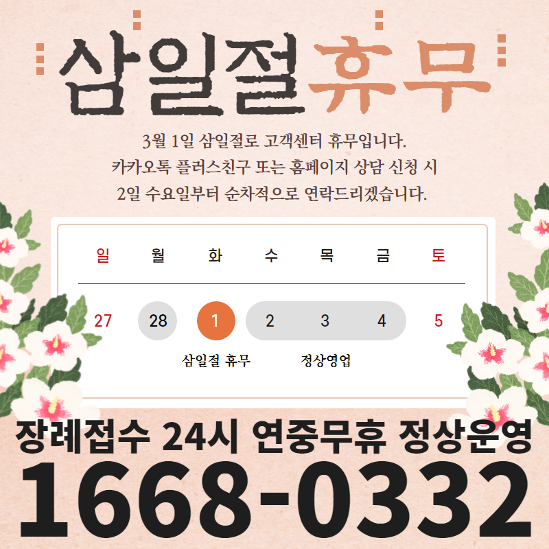 [공지] 고객센터 휴무 안내 페이지 정보 작성자 관리자 작성일22-02-25 10:47 관련링크 이전글 다음글 목록 본문 [삼일절 휴무] 3월 1일 삼일절로 고객센터 휴무입니다.카카오톡 플러스친구 또는 홈페이지 상담 신청 시 3월 2일 수요일부터 순차적으로 연락드리겠습니다. 장례접수 24시 연중무휴 정상운영1668-0332 이전글 다음글 목록