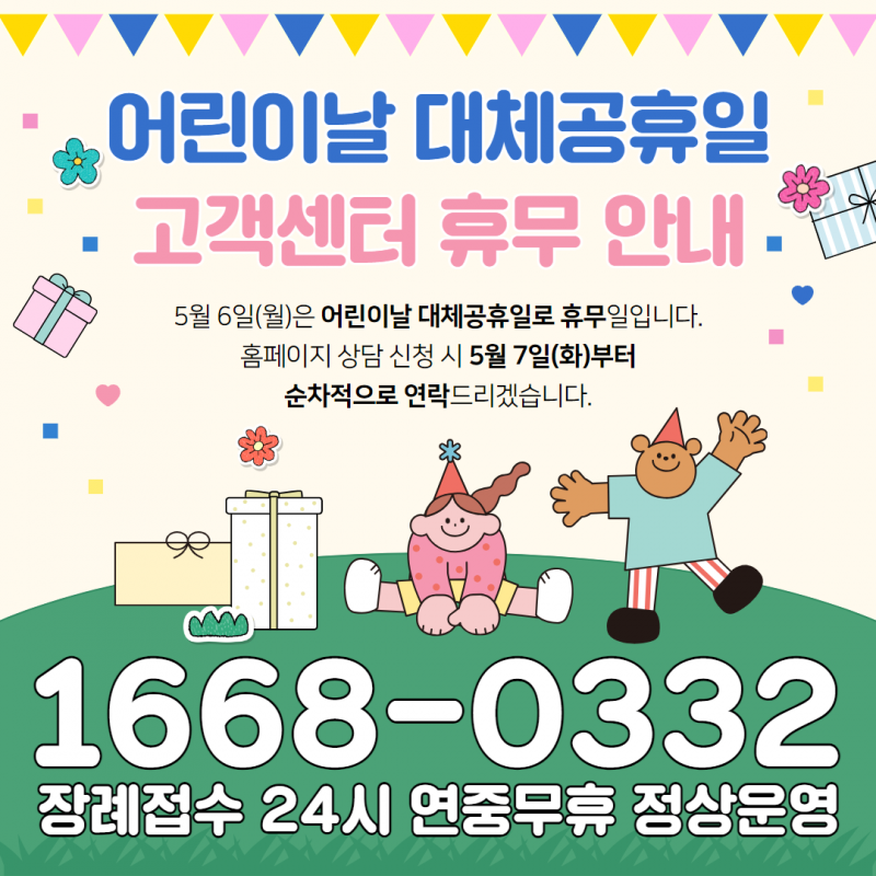 어린이날 고객센터 휴무 안내 페이지 정보 작성자 관리자 작성일24-05-02 10:52 관련링크 이전글 다음글 목록 본문 5월 6일(월)은 어린이날 대체공휴일로 휴무일입니다.홈페이지 상담 신청 시 5월 7일(화)부터순차적으로 연락드리겠습니다. 1668-0332장례접수 24시 연중무휴 정상운영 이전글 다음글 목록