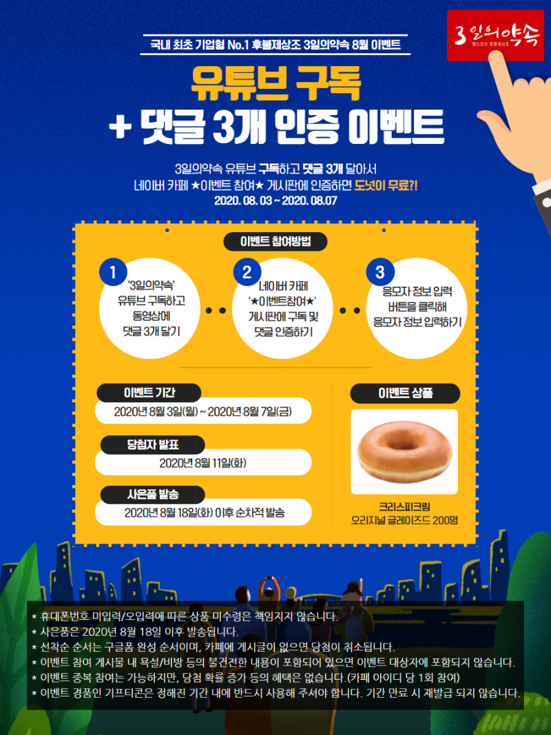 3일의약속 공식 카페 8월 이벤트 [유튜브 구독 + 댓글 3개 인증 이벤트]