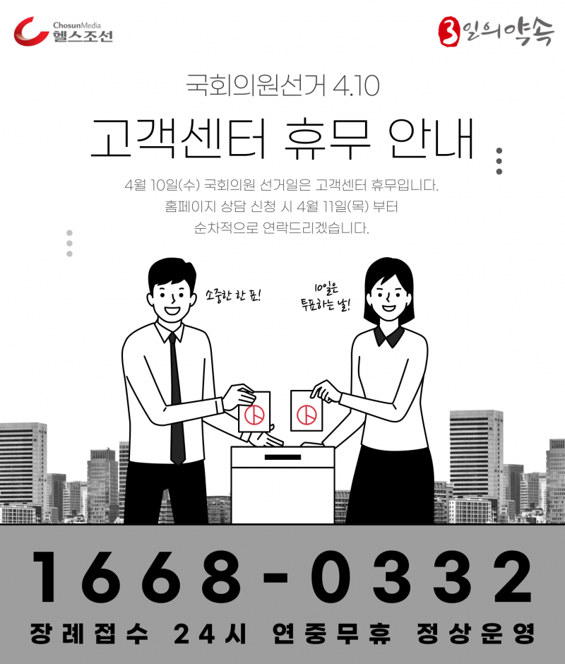 국회의원 선거일 고객센터 휴무 안내 페이지 정보 작성자 관리자 작성일24-03-28 13:26 관련링크 이전글 다음글 목록 본문 국회의원 선거일 고객센터 휴무 안내 4월 10일(수) 국회의원 선거일은 고객센터 휴무입니다.홈페이지 상담 신청 시 4월 11일(목)부터순차적으로 연락드리겠습니다. 1668-0332장례접수 24시 연중무휴 정상운영 이전글 다음글 목록