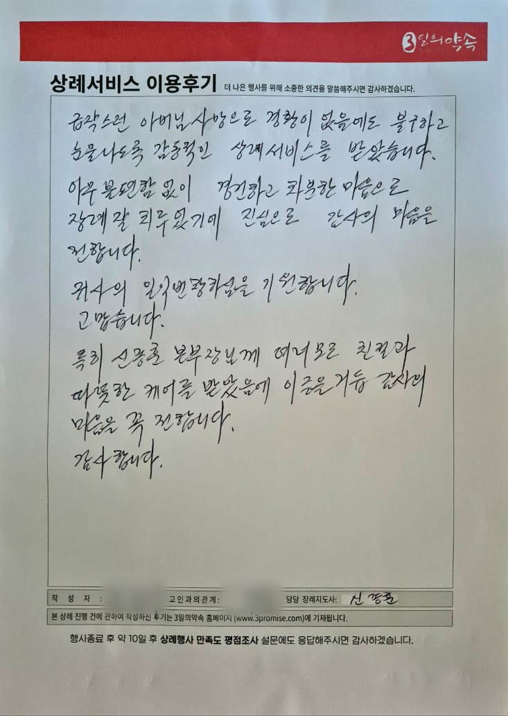 아무 불편함없이 경건하고 차분한 마음으로 장례 잘 치루었기에 진심으로 감사의 마음을 전합니다.