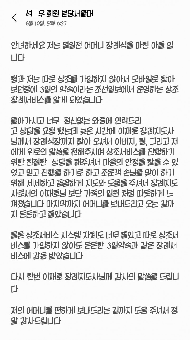 아버지, 형 그리고 저에게 위로의 말씀을 전해주시며 상조서비스를