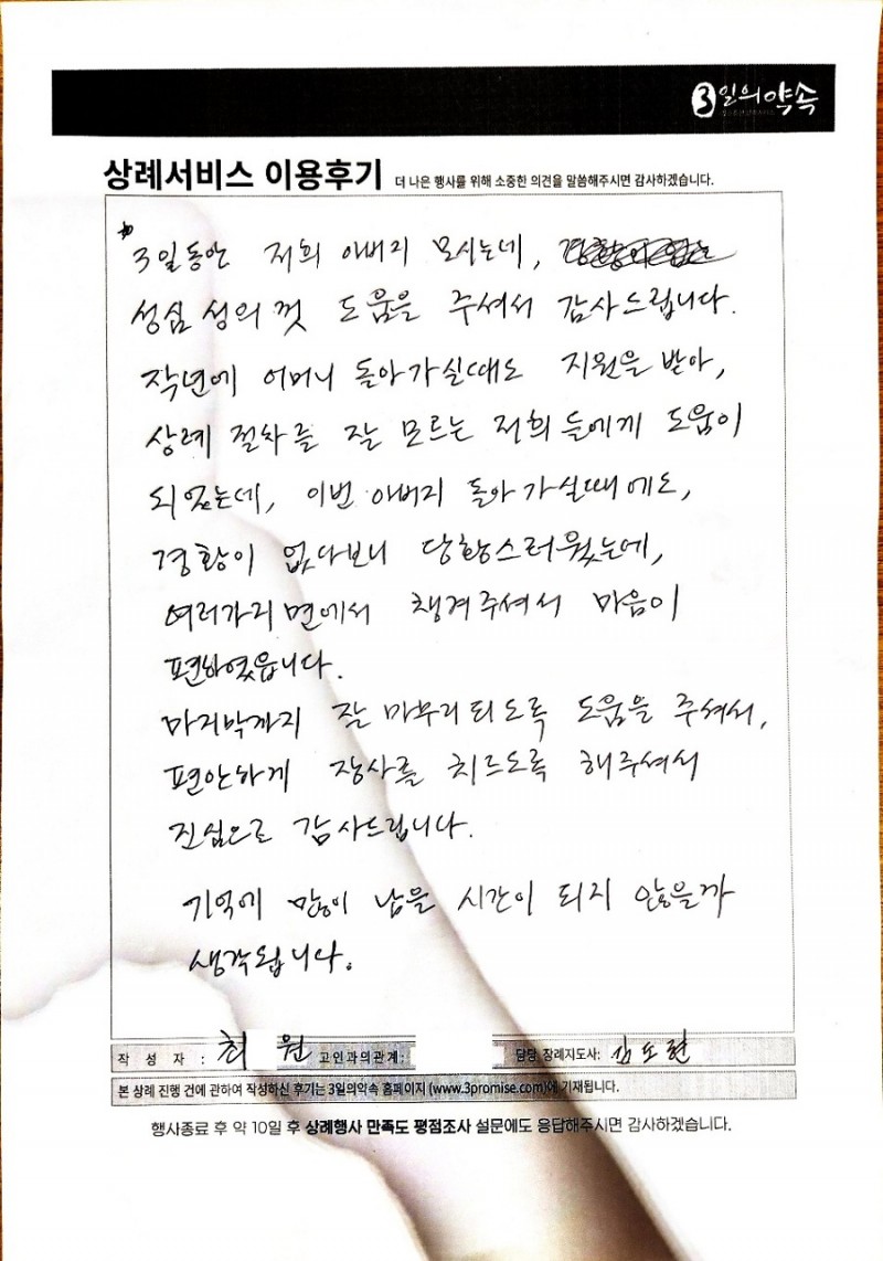삼성서울병원 장례식장 최○원 회원 장례서비스 이용후기 페이지 정보 작성자 관리자 작성일 목록 본문 3일동안 저희 아버지 모시는데 성심성의껏 도움을 주셔서 감사드립니다.작년에 어머니 돌아가실때도 지원을 받아, 상례 절차를 잘 모르는 저희들에게 도움이 되었는데,이번 아버지 돌아가실때에도, 경황이 없다보니 당황스러웠는데, 여러가지 면에서 챙겨주셔서 마음이 편하였읍니다.마지막까지 잘 마무리되도록 도움을 주셔서, 편안하게 장사를 치르도록 해주셔서 진심으로 감사드립니다.기억에 많이 남을 시간이 되지 않을까 생각됩니다. 목록