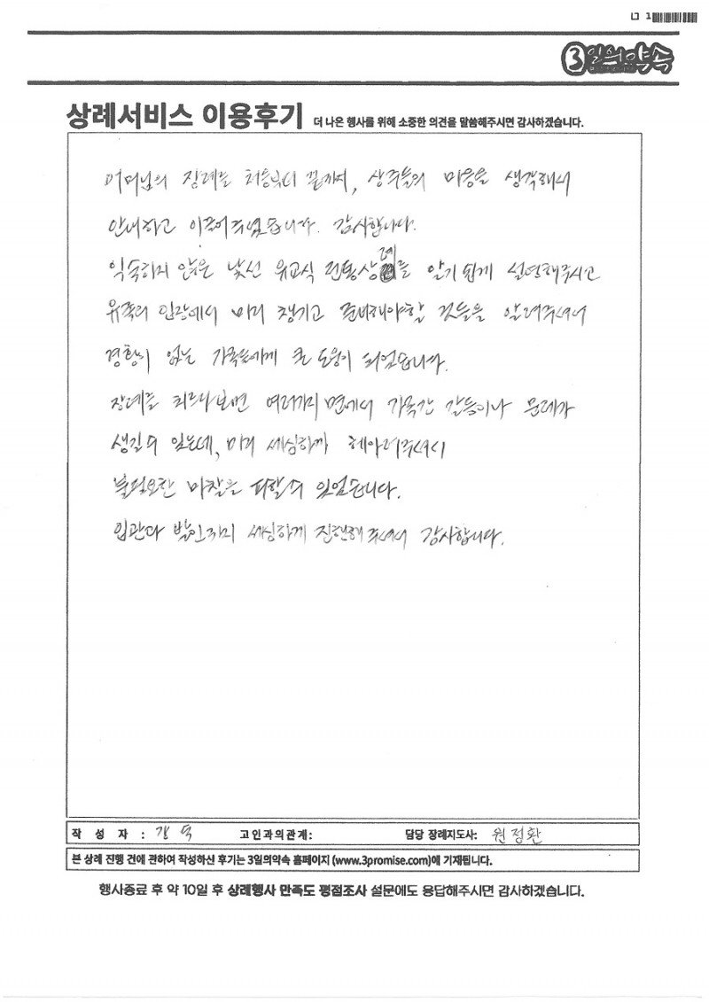 단양노인병원 장례식장 강○숙 회원 장례서비스 이용후기 페이지 정보 작성자 관리자 작성일 목록 본문 어머님의 장례를 처음부터 끝까지, 상주들의 마음을 생각해서 안내하고 이끌어주셨습니다. 감사합니다.익숙하지 않은 낯선 유고식 전통상례를 알기 쉽게 설명해주시고 유족의 입장에서 미리 챙기고 준비해야 할 것들을 알려주셔서 경황이 없는 가족들에게 큰 도움이 되었습니다,장례를 치르다보면 여러가지 면에서 가족간 갈등이나 문제가 생길수 있는데, 미리 세심하게 헤아려주셔서 불필요한 마찰을 피할수 있었습니다.입관과 발인까지 세심하게 진행해주셔서 감사합니다. 목록