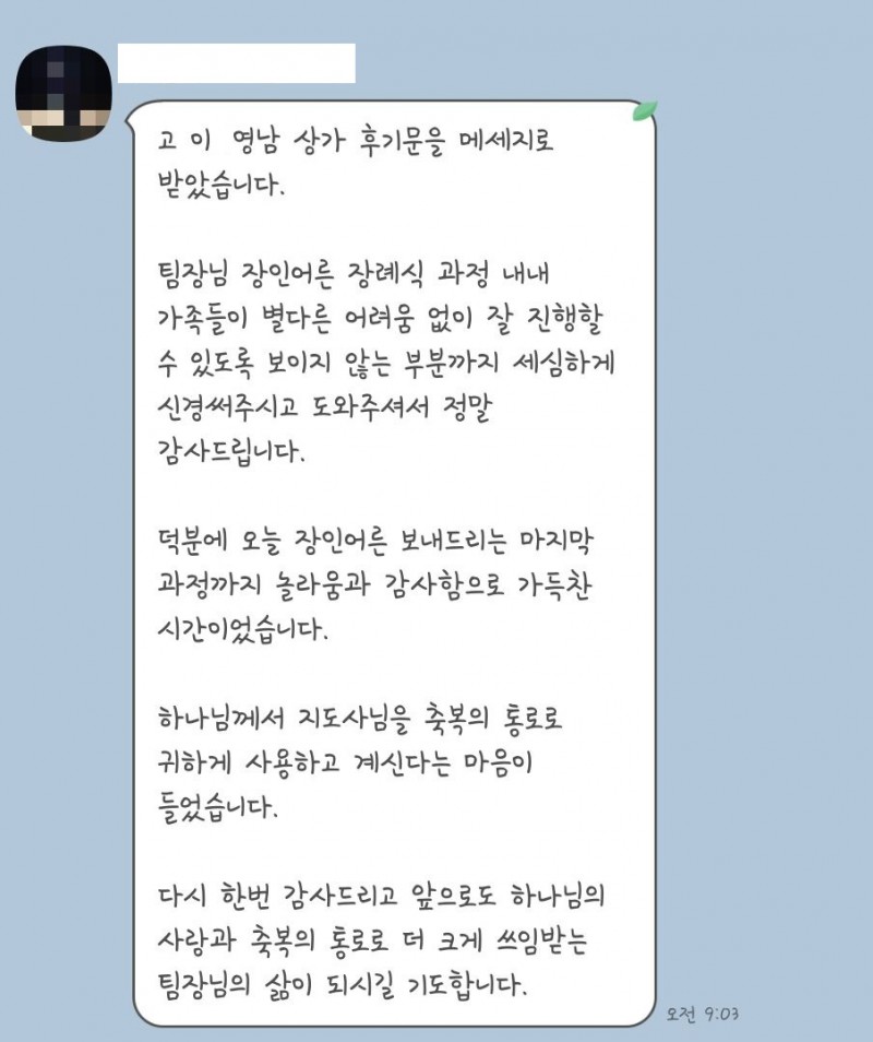 서울성모병원 장례식장 이○환 회원 장례서비스 이용후기 페이지 정보 작성자 관리자 작성일 목록 본문 장인어른 장례식 과정 내내 가족들과 별다른 어려움 없이 잘 진행할 수 있도록 보이지 않는 부분까지 세심하게 신경써주시고 도와주셔서 정말 감사드립니다. 덕분에 오늘 장인어른 보내드리는 마지막 과정까지 놀라움과 감사함으로 가득한 시간이었습니다.하나님께서 지도사님을 축복의 통로로 귀하게 사용하고 계신다는 마음이 들었습니다.다시 한번 감사드리고 앞으로도 하나님의 사랑과 축복의 통로로 더 크게 쓰임받는 팀장님의 삶이 되시길 기도합니다. 목록