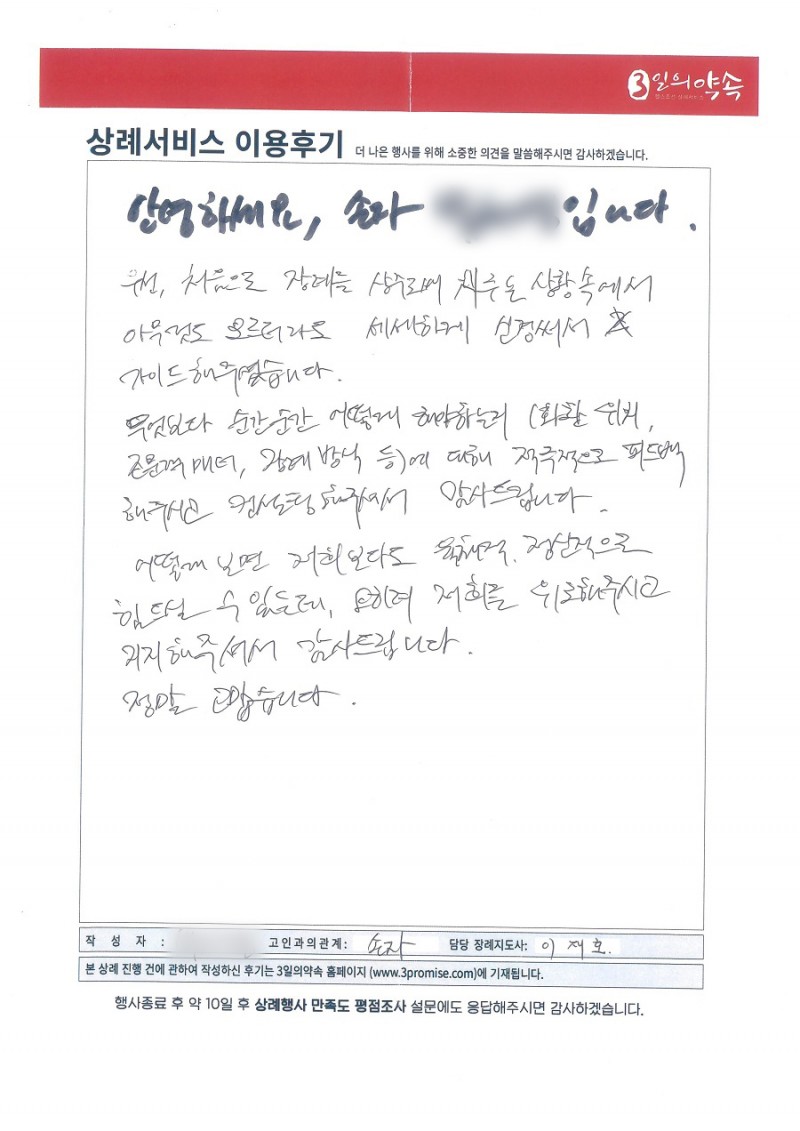 서울성모병원 장례식장 박○훈 회원 장례서비스 이용후기 페이지 정보 작성자 관리자 작성일 목록 본문 안녕하세요, 손자 OOO입니다. 우선 처음으로 장례를 상주로써 치루는 상황속에서 아무것도 모르더라도 세세하게 신경써서 가이드 해주었습니다. 무엇보다 순간순간 어떻게 해야하는지 (화환 위치, 조문객 매너, 장례 방식 등)에 대해 적극적으로 피드백 해주시고 컨설팅 해주셔서 감사드립니다. 어떻게 보면 저희보다도 육체적, 정신적으로 힘드실 수 있는데, 오히려 저희를 위로해주시고 지지해주셔서 감사드립니다. 정말 고맙습니다. 목록