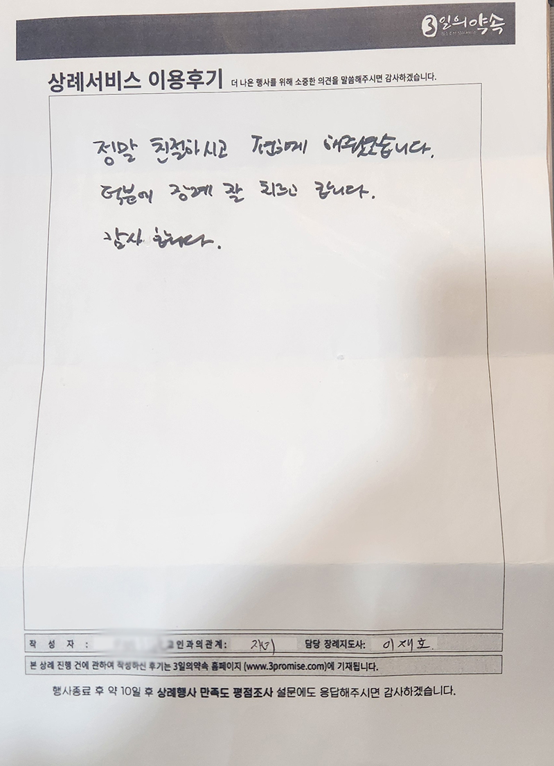 일산동국대병원 장례식장 손○현 회원 장례서비스 이용후기 페이지 정보 작성자 관리자 작성일 목록 본문 정말 친절하시고 편하게 해주셨습니다. 덕분에 장례 잘 치르고 갑니다. 감사합니다. 목록