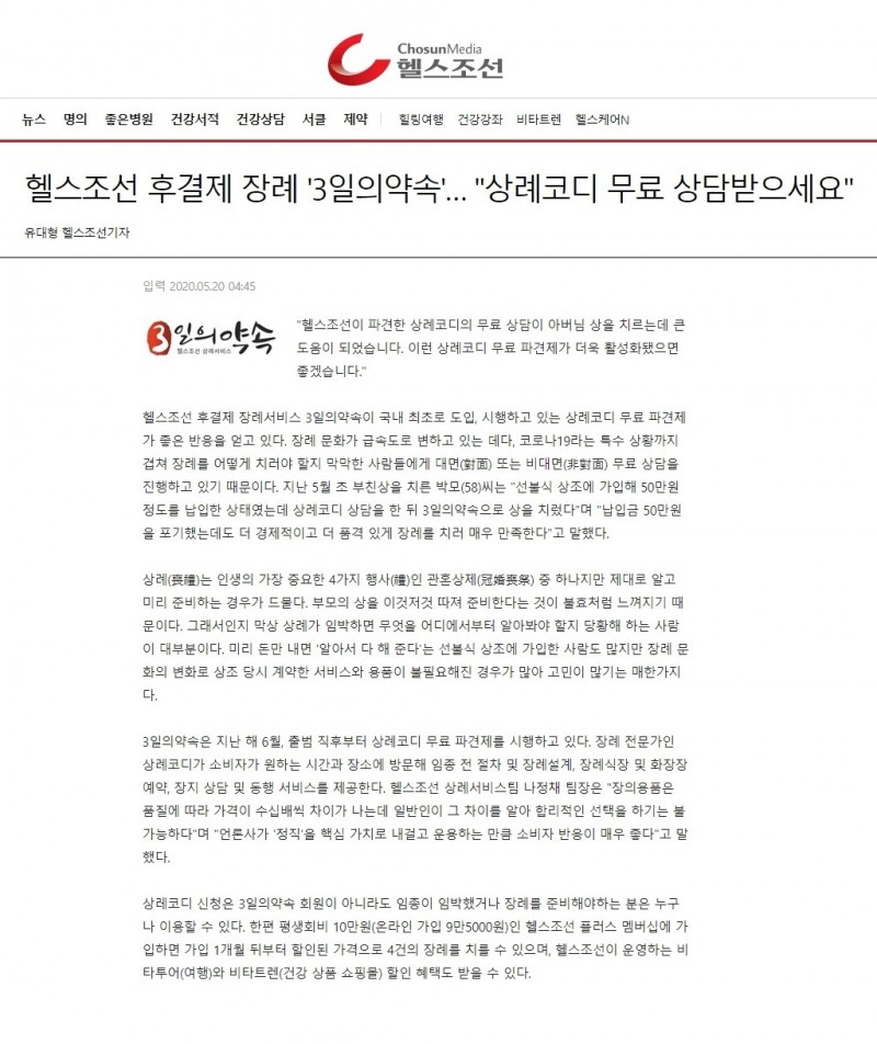 3일의약속은 지난 해 6월, 출범 직후부터 상례코디 무료 파견제를 시행하고 있다. 장례 전문가인 상례코디가 소비자가 원하는 시간과 장소에 방문해 임종 전 절차 및 장례설계, 장례식장 및 화장장 예약, 장지 상담 및 동행 서비스를 제공한다. 헬스조선 상례서비스팀 나정채 팀장은 "장의용품은 품질에 따라 가격이 수십배씩 차이가 나는데 일반인이 그 차이를 알아 합리적인 선택을 하기는 불가능하다"며 "언론사가 '정직'을 핵심 가치로 내걸고 운용하는 만큼 소비자 반응이 매우 좋다"고 말했다.