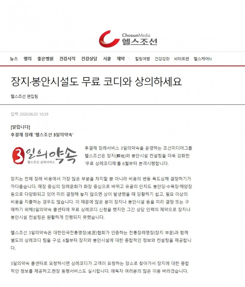 후결제 장례서비스 3일의약속을 운영하는 조선미디어그룹 헬스조선은 장지(葬地)와 봉안시설 컨설팅을 더욱 강화한 '무료 상례코디제'를 6월부터 본격시행합니다.