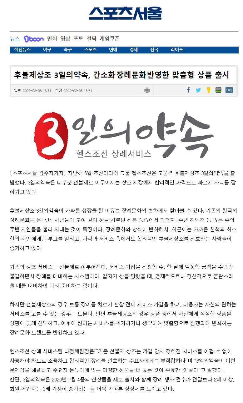 [스포츠서울 김수지기자] 지난해 6월 조선미디어 그룹 헬스조선은 고품격 후불제상조 3일의약속을 출범했다. 3일의약속은 대부분 선불제로 이루어지는 상조 시장에서 합리적인 가격으로 빠르게 자리를 잡아가고 있다.